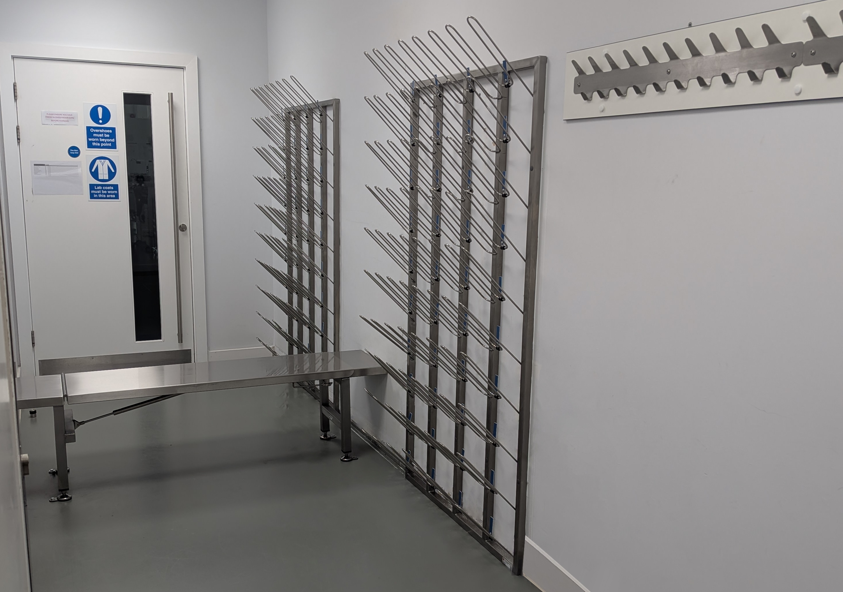 We offer a full range of stainless steel cleanroom furniture, such as the laser-cut coat rack seen here! We even offer a free custom design service for specialised pieces of furniture, such as the bespoke hinged stepover bench in the above installation!
