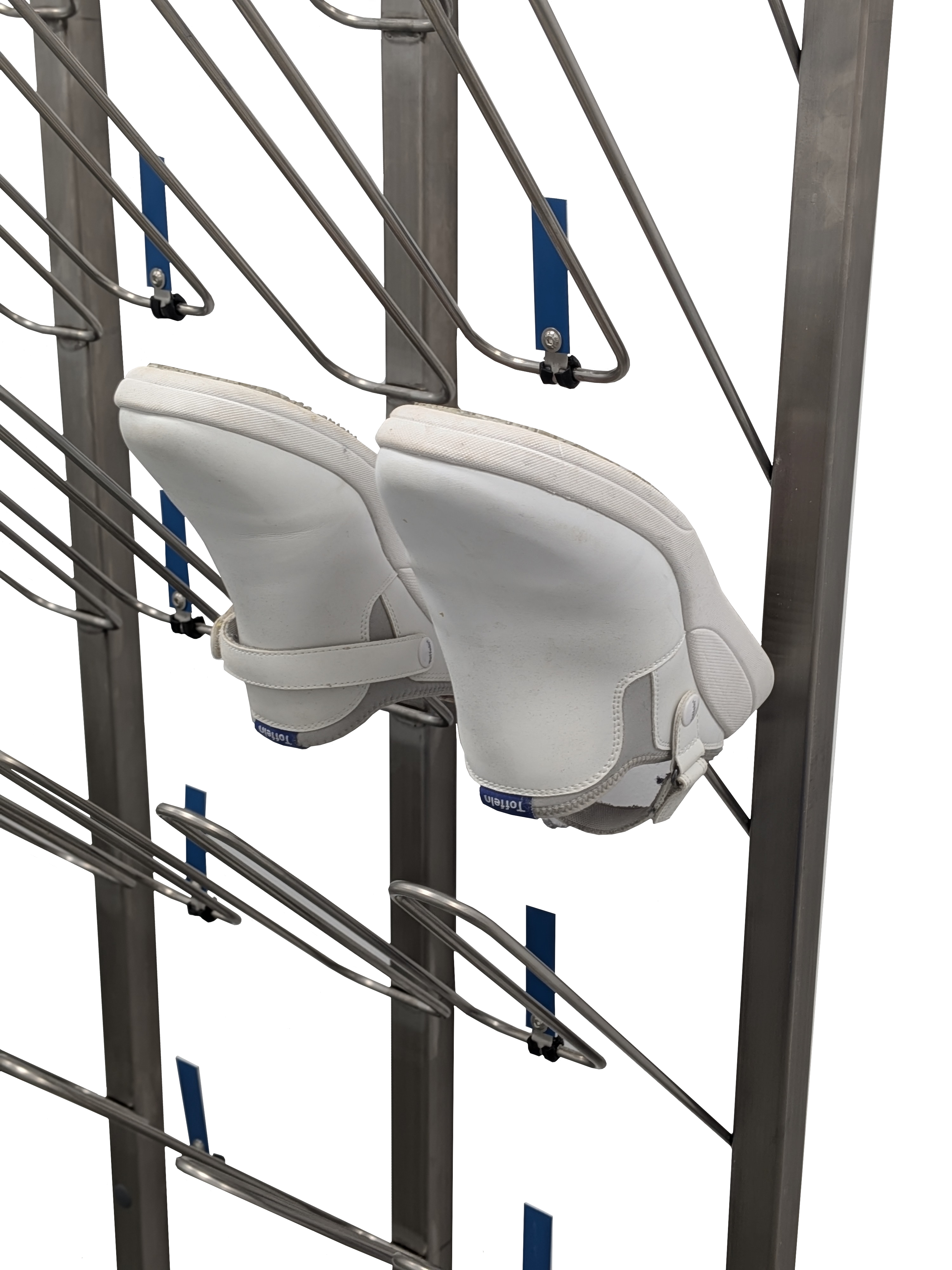 A high quality 304 or 316 Grade stainless steel wall mounted shoe/boot rack. The design allows for ease of cleaning and neat storage of cleanroom footwear.